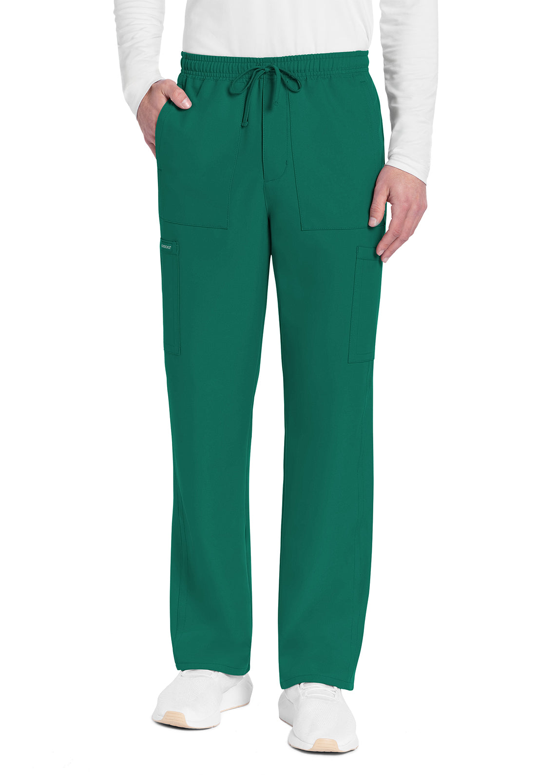 A true Men's fit pant with zipper fly, this style offers lots of pockets and functional styling. The mid rise elastic-reinforced waistband includes a drawstring for adjustability. There are six pockets for organized storage: two side entry patch pockets, two cargo pockets with pen/instrument slots, and two back patch pockets. The cargo pockets and back pockets have reverse hem trim for added detailing. Forward leg seams provide leg-lengthening style. Decorative tonal topstitching finishes this style. Straight leg, 19" opening.