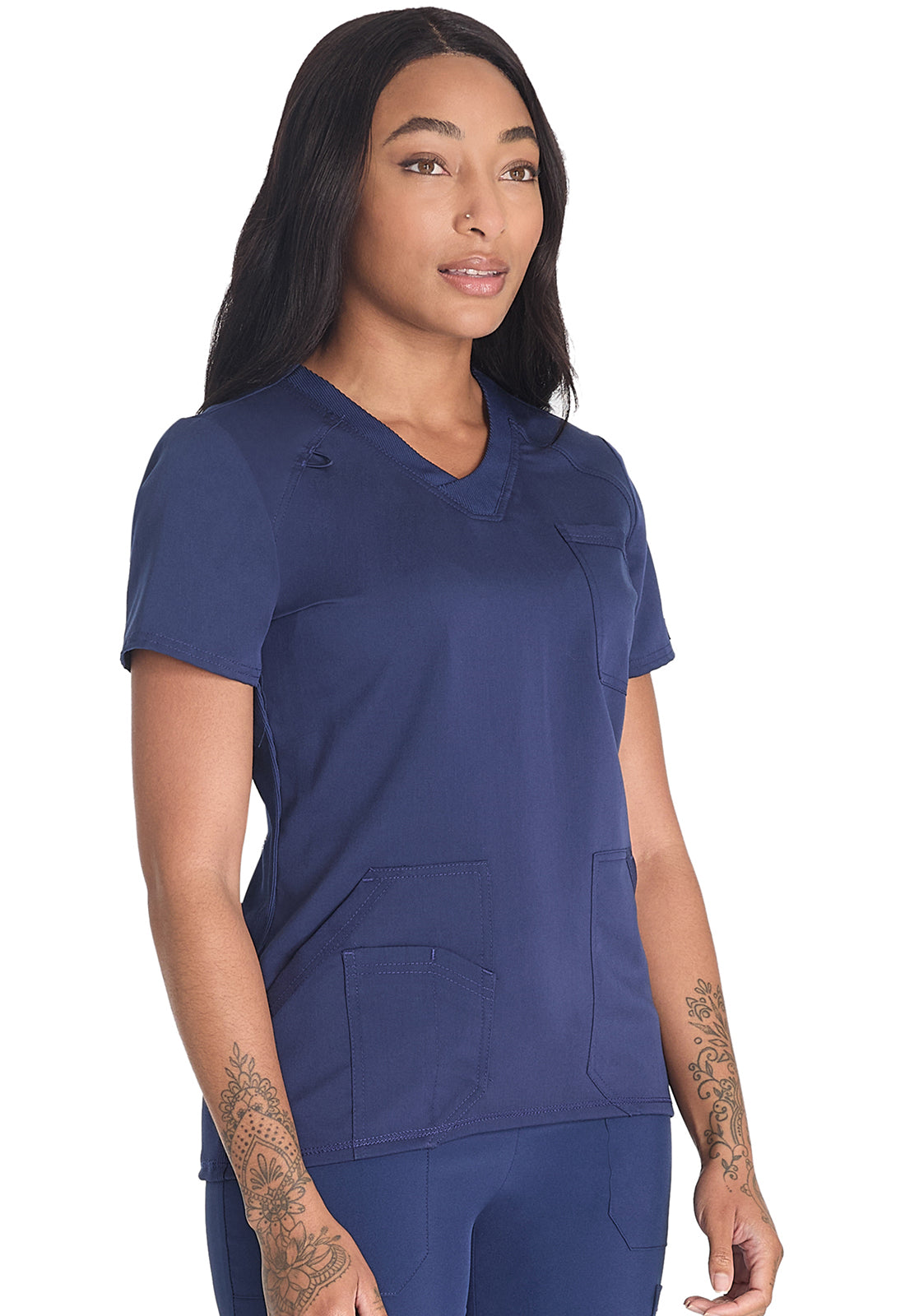 Designed to balance style and function, this v-neck top has stretchy rib-knit trim and lots of pockets. There is tonal rib-knit trim on the shaped neckband, pocket edges, and comfy back side panels. Four pockets provide plenty of storage space: one chest patch pocket, two roomy front patch pockets, and an accessory pocket with instrument slot layered on the wearer's right pocket. Front and back curved shoulder yokes provide fit plus style. Bungee ID badge loop on wearer's right shoulder yoke. Rounded high-low hem finishes this v-neck scrub top. Contemporary fit. Center back length: 26 inches