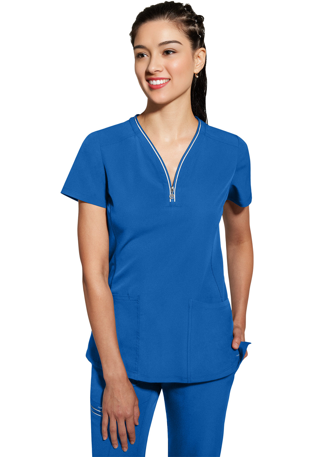 Yoga Knit V-Neck Top features 2 potch pockets. Slimming knit side panels gives a better fit. Grosgrain ribbon and grommet details adds charm to this top.