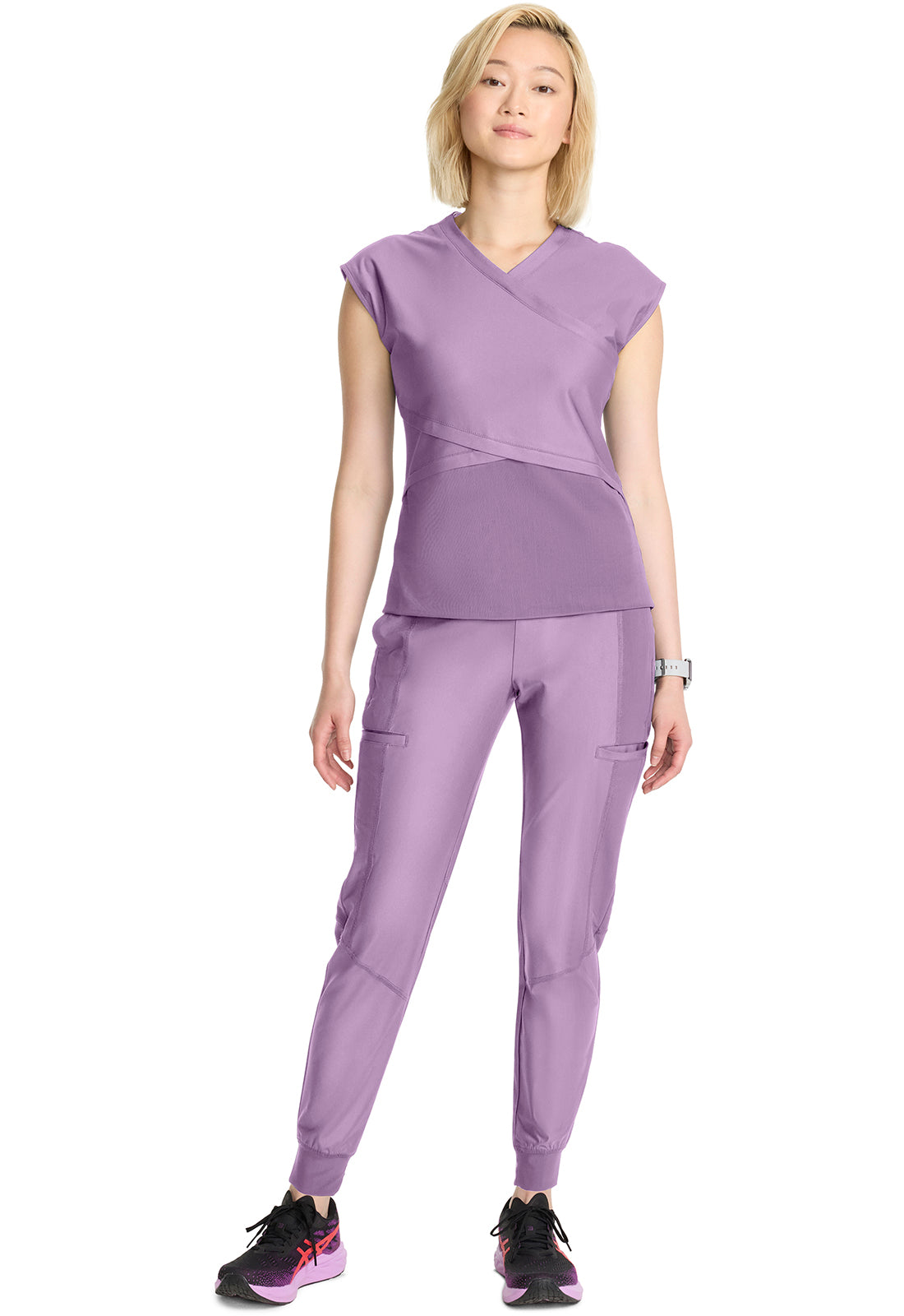 That's a wrap! Upgrading your scrub game just got easier, thanks to the infinitely cool style of this trendy dolman top. A flattering fit and wide waist panel create a defined silhouette, with 360 stretch for all-around movement.,