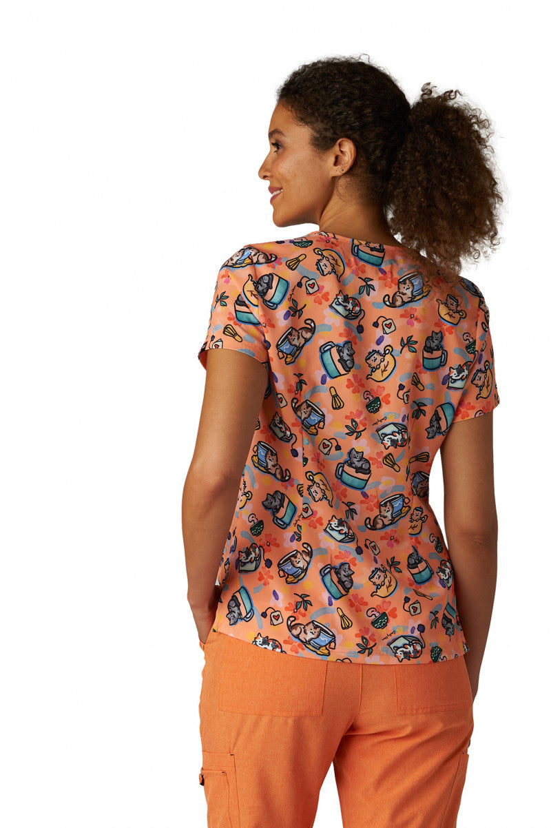 This sporty, contemporary stretch print scrub top from the koi Artists Series is part of our exclusive collab with the lifestyle brand Bright Spot Design by Emily Chan. Emily is most known for her whimsical greeting cards and playful illustration style. She loves connecting people through her love of food and puns, capturing moments little and big, while representing a unique Asian-American voice. This limited edition top features a classic v-neckline, 2 front pockets for your essentials, and side slits for ease of movement.