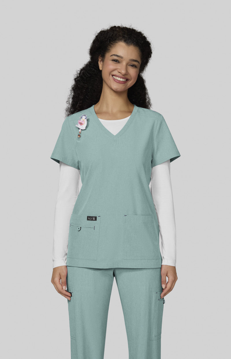 In Heather Sage, the 373 Becca Scrub Top by Koi Basics blends flexibility and function for busy shifts. Key details include classic v-neck, contrast print facing at neck, bungee loop for id badge, lightweight, moisture-wicking fabric, and four pockets, including hidden cell phone pocket with print lining.