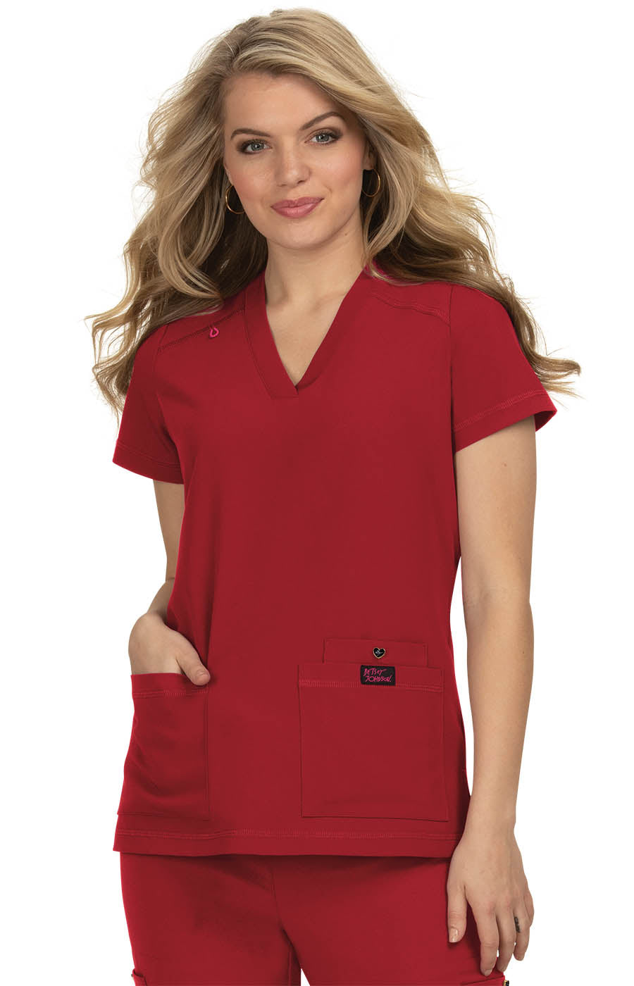 With breathable fabric and smart features, the B101 Freesia Scrub Top by Koi Betsey Johnson in Ruby keeps you going strong. Key details include classic v-neck, bungee loop for id badge, print facing at neck, three front pockets including a snap button pocket, and side slits.