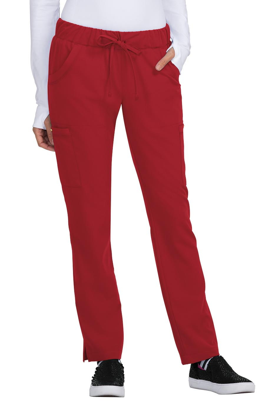 In Ruby, the B700 Buttercup Scrub Pants by Koi Betsey Johnson combine flexibility and dependable comfort. Key details include elastic waist with drawstring ties, print facing at interior waist, two front pockets, two side pockets with metal snaps, and two back pockets.