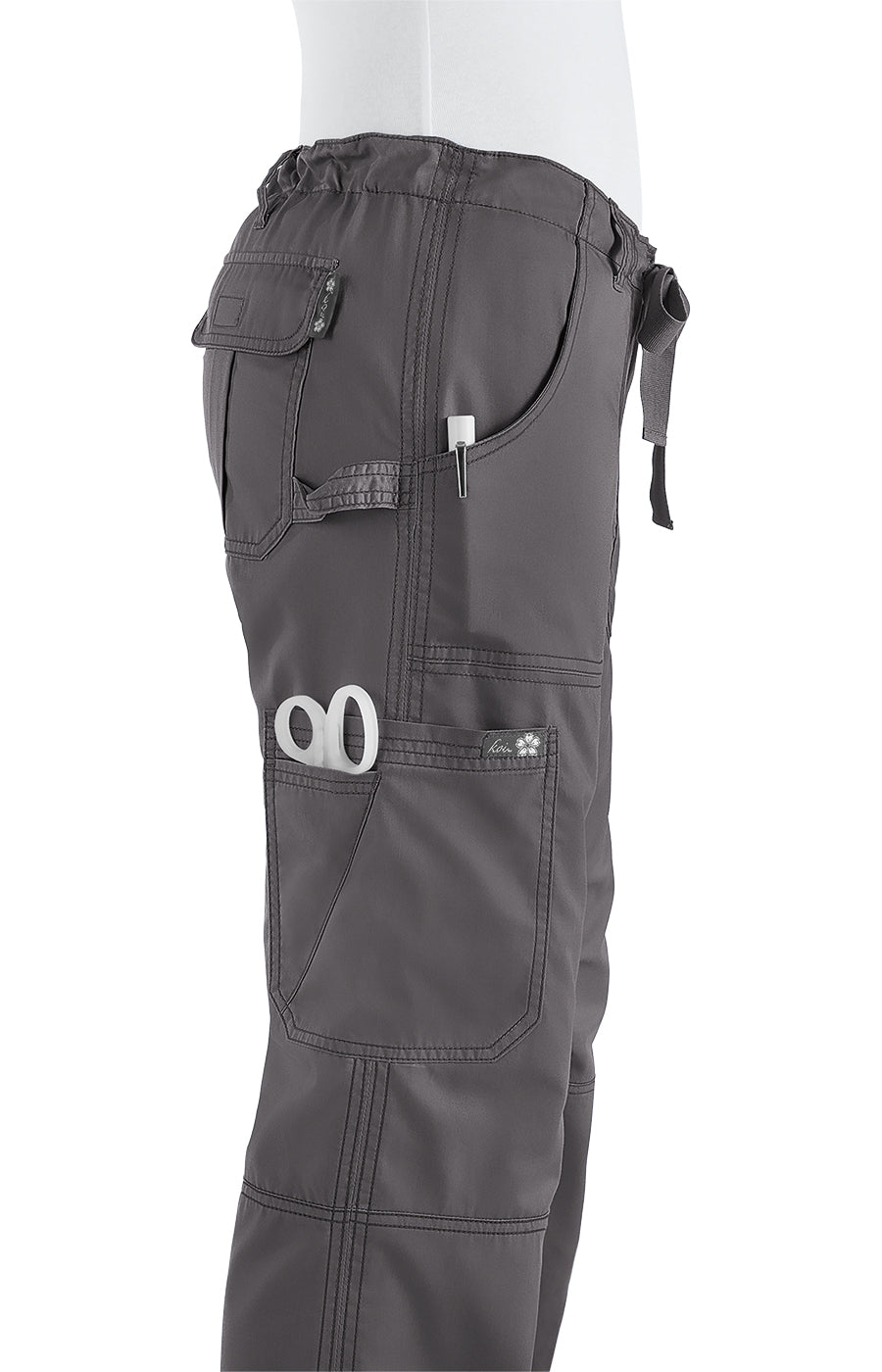 In Steel, the 701 Lindsey Scrub Pants by Koi Classics combine flexibility and dependable comfort. Key details include easy fit low-rise pants, with adjustable drawstring waist, multiple pockets including a scissors pocket, d-ring, and adjustable toggle at ankle, modern bootcut, and 55% cotton, 45% polyester soft twill.