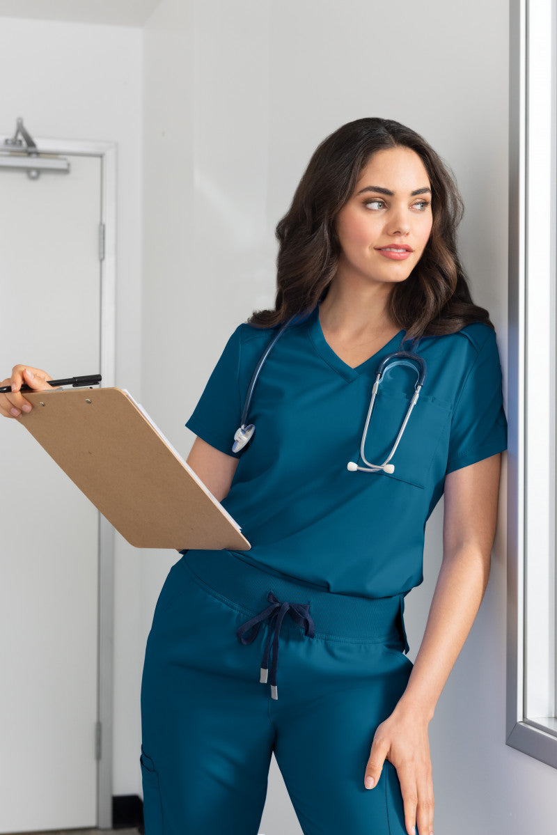 In Caribbean Blue, the C100 Aura Scrub Top by Koi Cureology blends flexibility and function for busy shifts. Key details include classic v-neck, chest pocket, sleeve pocket, 3 pen slots, and side slits.