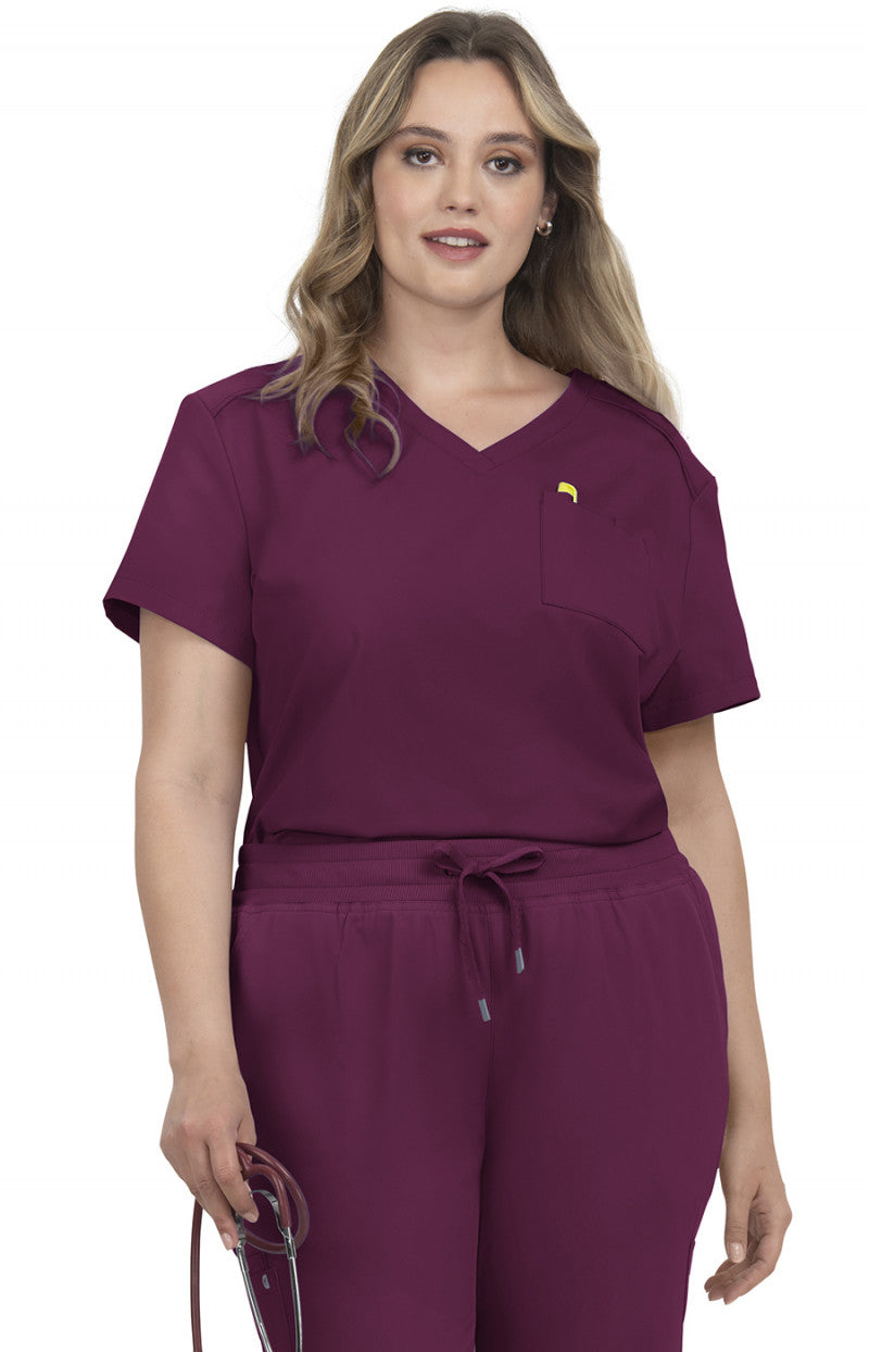 In Wine, the C100 Aura Scrub Top by Koi Cureology blends flexibility and function for busy shifts. Key details include classic v-neck, chest pocket, sleeve pocket, 3 pen slots, and side slits.