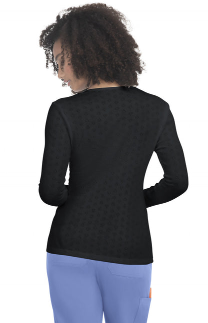 In Black, the 1110 Rohan Tee Heart Pointelle Scrub Top by Koi Essentials blends flexibility and function for busy shifts. Key details include cottony soft long-sleeve tee, heart pointelle detail, looks greats layered or solo, length, size small: 27", and 100% cotton.