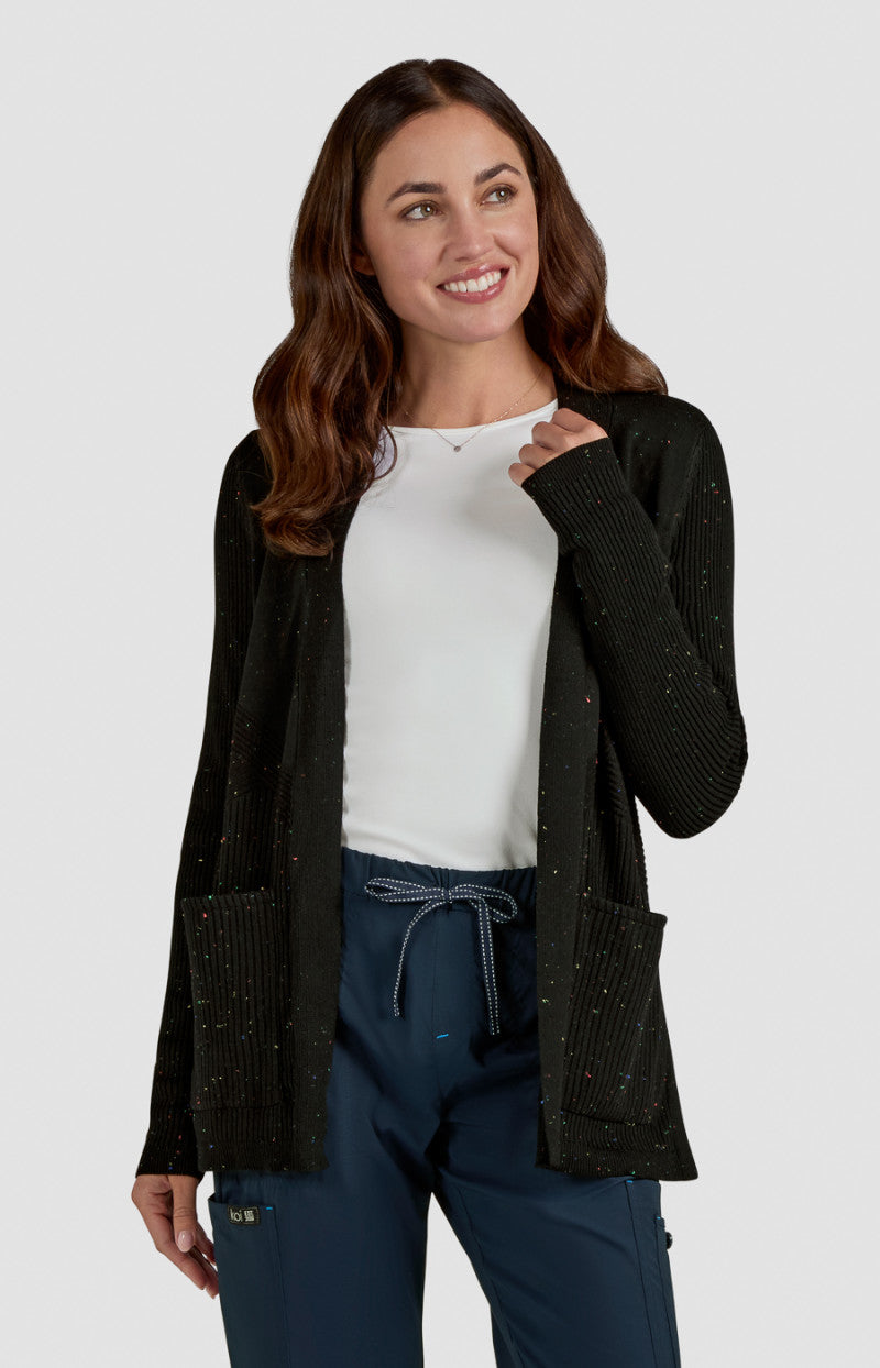 With breathable fabric and smart features, the 463 Kori Sweater Scrub Top by Koi Essentials in Black Multi-Color Speckled Dots keeps you going strong. Key details include features geometric knit patterns, 2 front pockets, looks great layered over scrubs, length size small: 28 1/4", and 78% rayon, 20% polyester, 2% cotton.