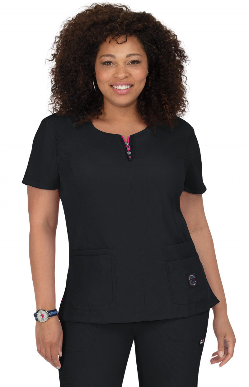 Stay stylish and confident in the 317 Serenity Scrub Top by Koi Lite in Black, made for everyday wear. Key details include double-zipper at neck, breathable, moisture-wicking fabric, easy wash and wear, four front pockets, and rib knit trim on sides.