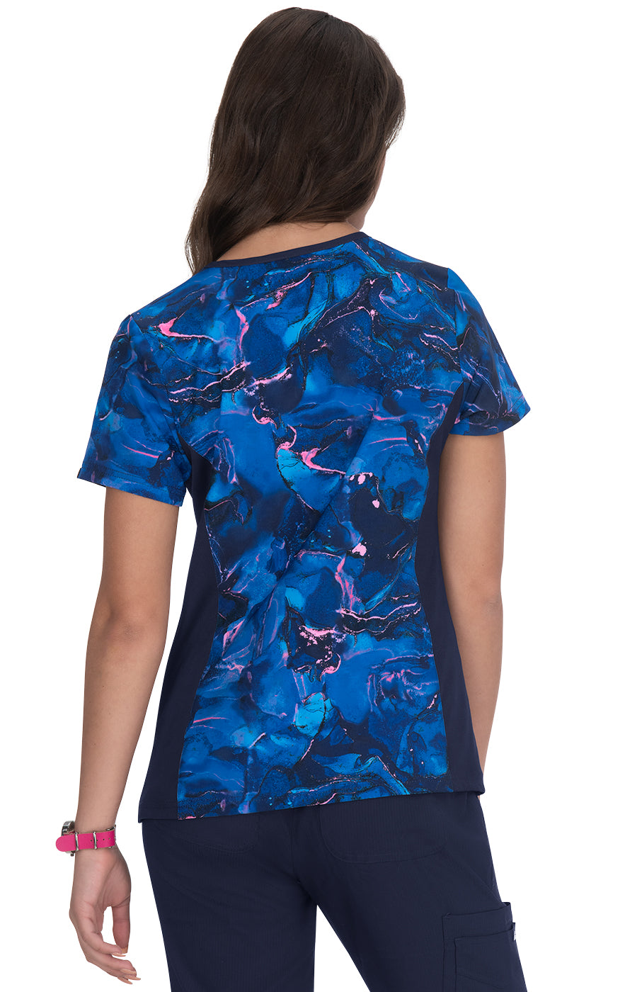 In Marbulous Pinks, the 385PR Raquel Scrub Top by Koi Lite blends flexibility and function for busy shifts. Key details include front yoke with mock-wrap neck, front waist darts for shaping, three front pockets, easy care, fade-resistant, 4-way stretch fabric, and side slits.