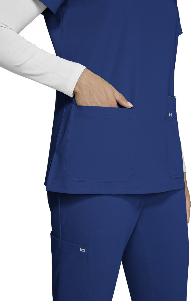 Designed for healthcare pros, the 1019 Hustle and Heart Scrub Top by Koi Next Gen in Galaxy combines practicality with style. Key details include wide v-neck, badge loop for id badge, 3 pockets, signature back tab detail, and side slits.