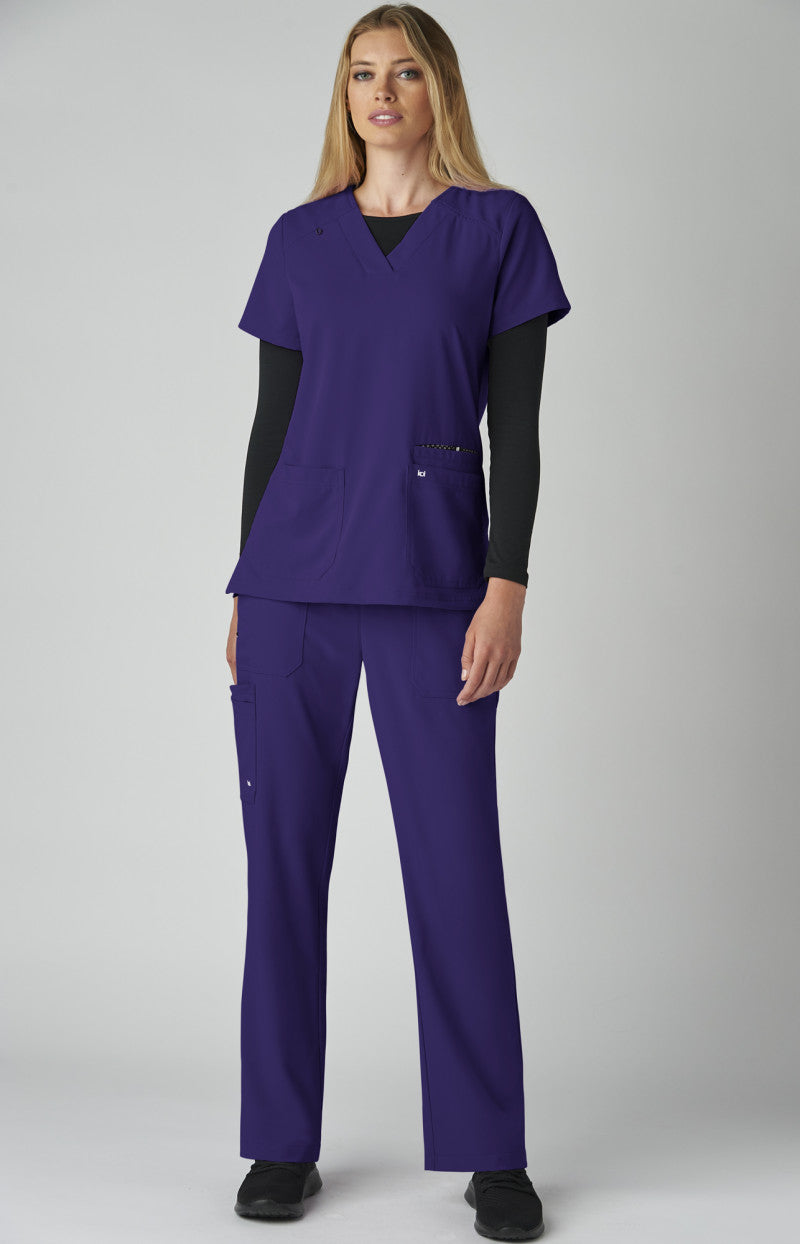 Designed for healthcare pros, the 1019 Hustle and Heart Scrub Top by Koi Next Gen in Grape combines practicality with style. Key details include wide v-neck, badge loop for id badge, 3 pockets, signature back tab detail, and side slits.