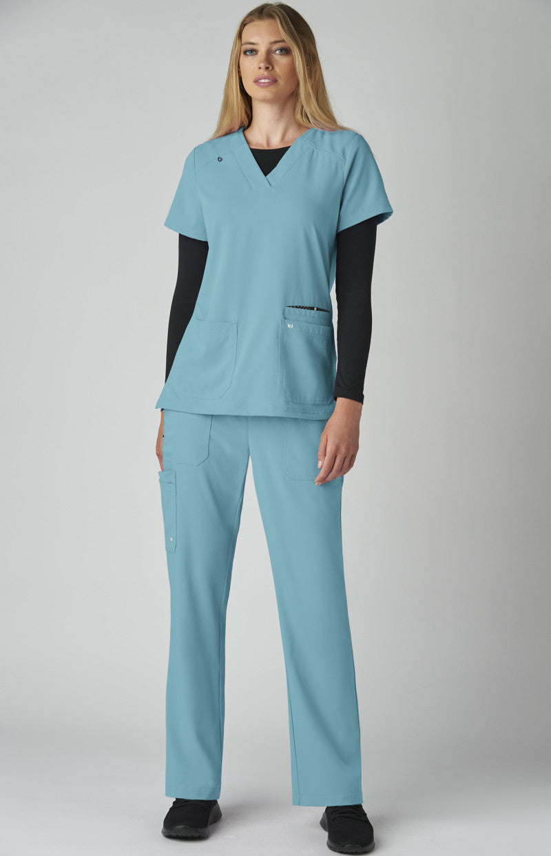 Designed for healthcare pros, the 1019 Hustle and Heart Scrub Top by Koi Next Gen in Sea Glass combines practicality with style. Key details include wide v-neck, badge loop for id badge, 3 pockets, signature back tab detail, and side slits.