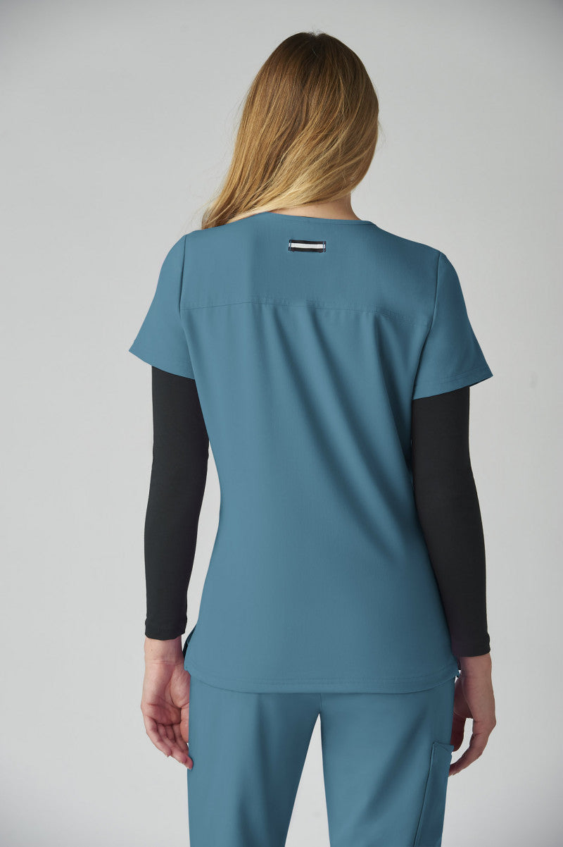 Designed for healthcare pros, the 1019 Hustle and Heart Scrub Top by Koi Next Gen in Teal combines practicality with style. Key details include wide v-neck, badge loop for id badge, 3 pockets, signature back tab detail, and side slits.