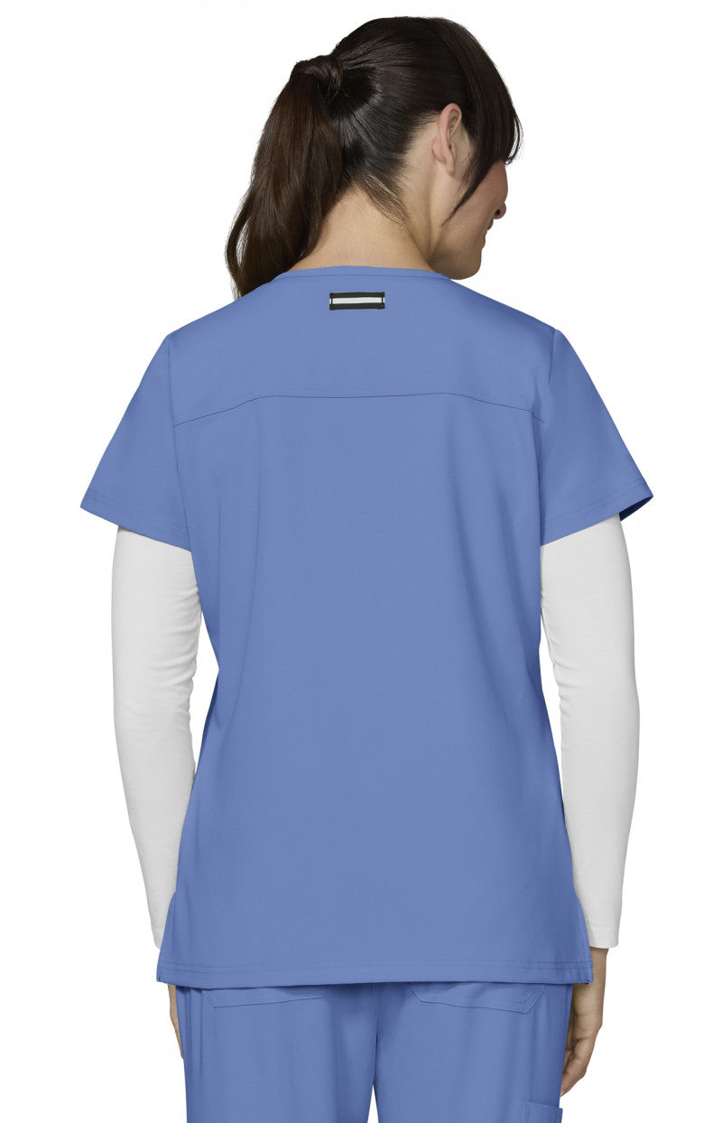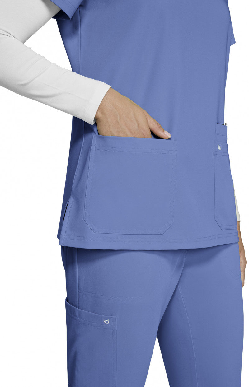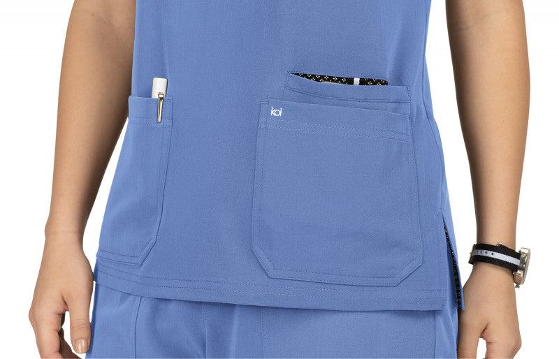 Designed for healthcare pros, the 1019 Hustle and Heart Scrub Top by Koi Next Gen in True Ceil combines practicality with style. Key details include wide v-neck, badge loop for id badge, 3 pockets, signature back tab detail, and side slits.