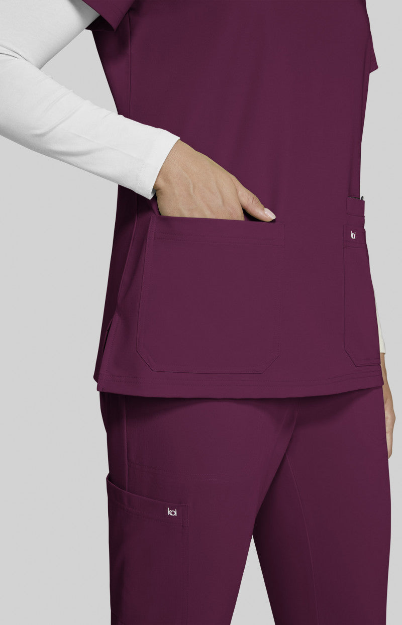 Designed for healthcare pros, the 1019 Hustle and Heart Scrub Top by Koi Next Gen in Wine combines practicality with style. Key details include wide v-neck, badge loop for id badge, 3 pockets, signature back tab detail, and side slits.