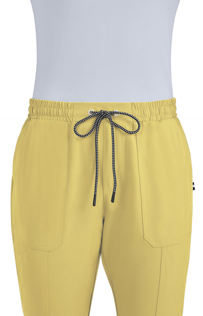 The 740 Good Vibe Scrub Pants by Koi Next Gen, available in Butter Yellow, bring durable comfort to long shifts. Key details include elastic waistband with drawstring ties, mid-rise waist, 2 front pockets, 2 cargo pockets, 2 back pockets, jogger leg with ribbed hem, and signature stripe tab.
