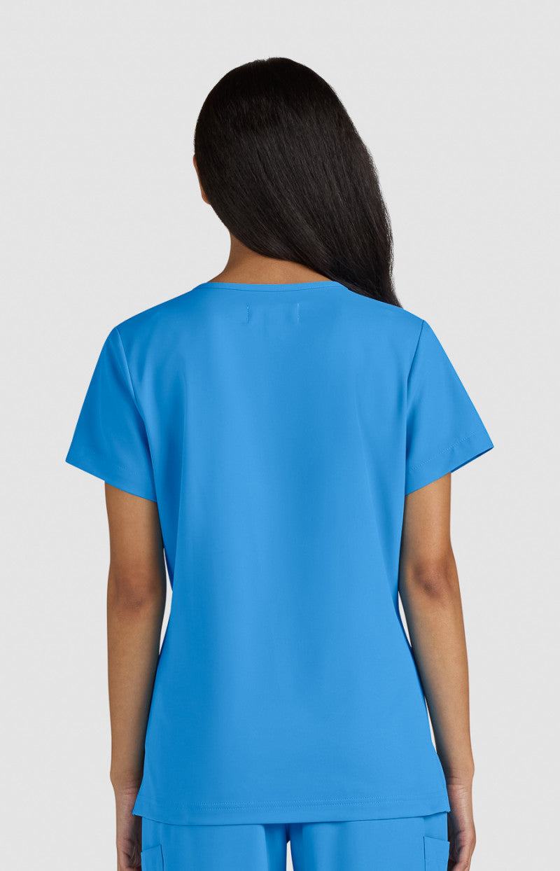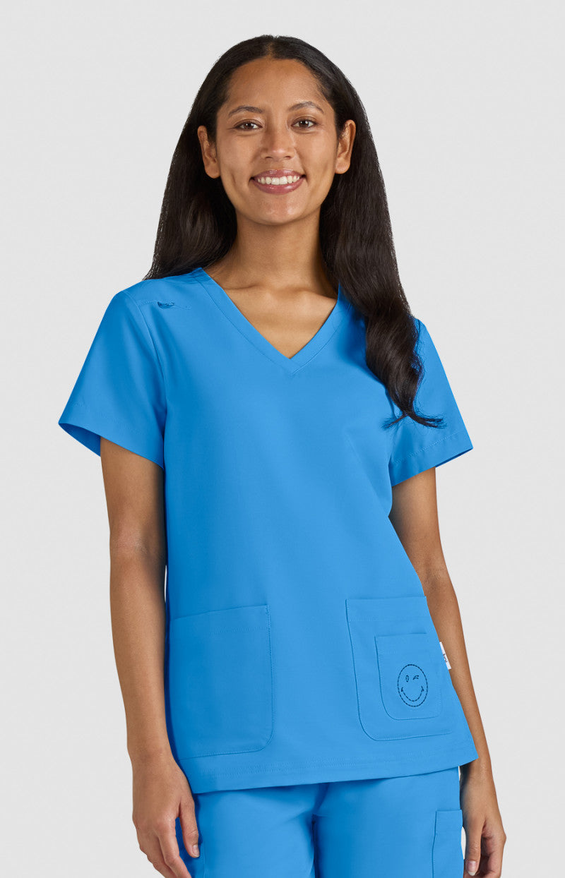 Stay stylish and confident in the S101 Blissful Scrub Top by Koi Smiley World in Power Blue, made for everyday wear. Key details include classic v-neck, shoulder darts, id badge loop, 3 pockets (1 with embroidered smiley face), and side slits.