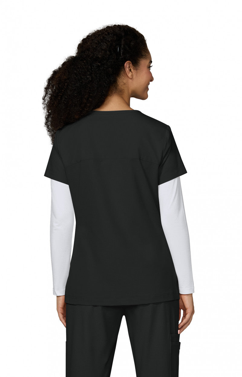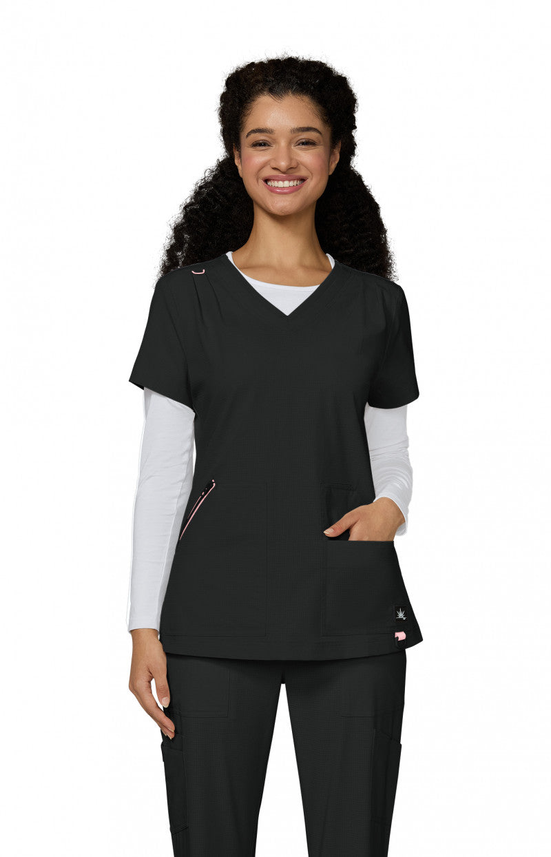 With breathable fabric and smart features, the 1129 Sari Scrub Top by Koi Solis in Black keeps you going strong. Key details include ribbed v-neck, contrast bungee cord for id badge, contrast tab and d-ring, 4 pockets (including pocket with contrast zipper), and side slits.