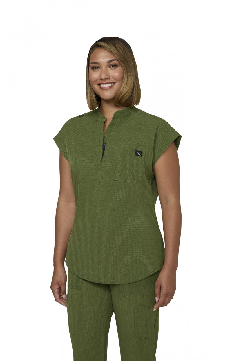 In Martini Olive, the 1131 Catrin Scrub Top by Koi Solis blends flexibility and function for busy shifts. Key details include zipper at neck, contrast bungee cord for id badge, combo chest pocket (2 pockets and pen slot), side slits, and can be worn tucked in or out.