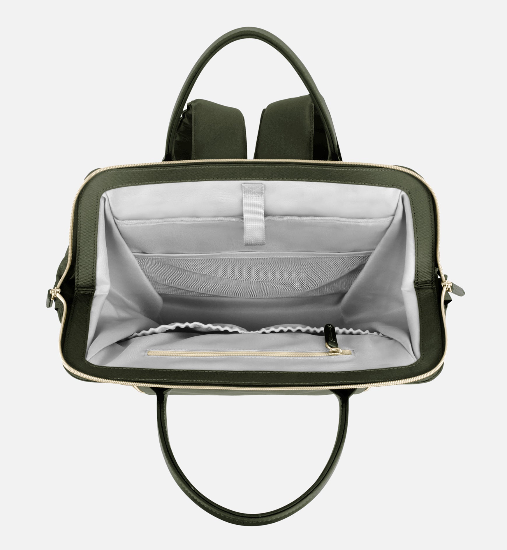 - Exterior has a large front zipper pocket with built-in interior pockets