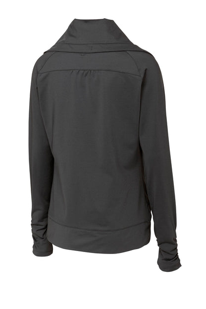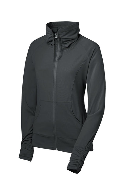 A stretchy moisture-wicking performance jacket with a soft-brushed backing and unique cowl collar.6.8-ounce 90/10 poly/spandex jersey Tag-free label Zip-through cowl collar with ruching Dyed-to-match drawcord Dyed-to-match Sport-Tek logo neck taping Reverse coil zipper Raglan sleeves Front pouch pockets Ruching at cuffs Self-fabric hem
